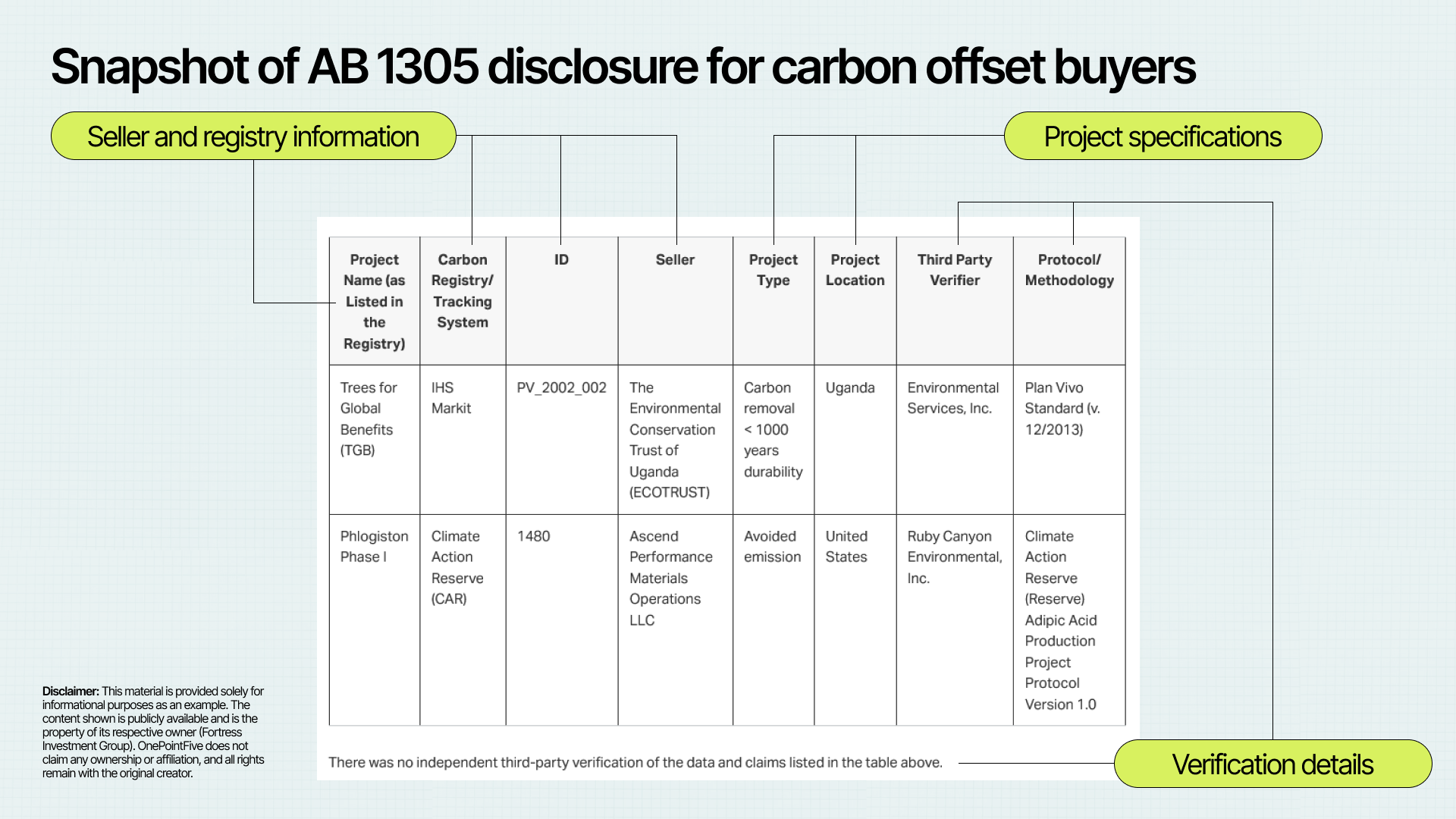 Sellers must also disclose accountability measures for projects in-progress. This includes details about what will happen if the project fails to meet projected emissions reduction or removal targets.